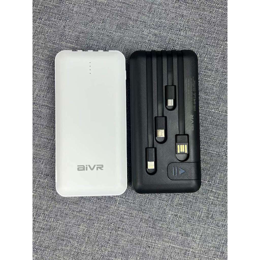 The AIVR iP15 is a compact 10000mAh power bank featuring built-in Lightning, Micro USB, USB-A, and USB Type-C cables, offering up to 15W fast charging for various devices.