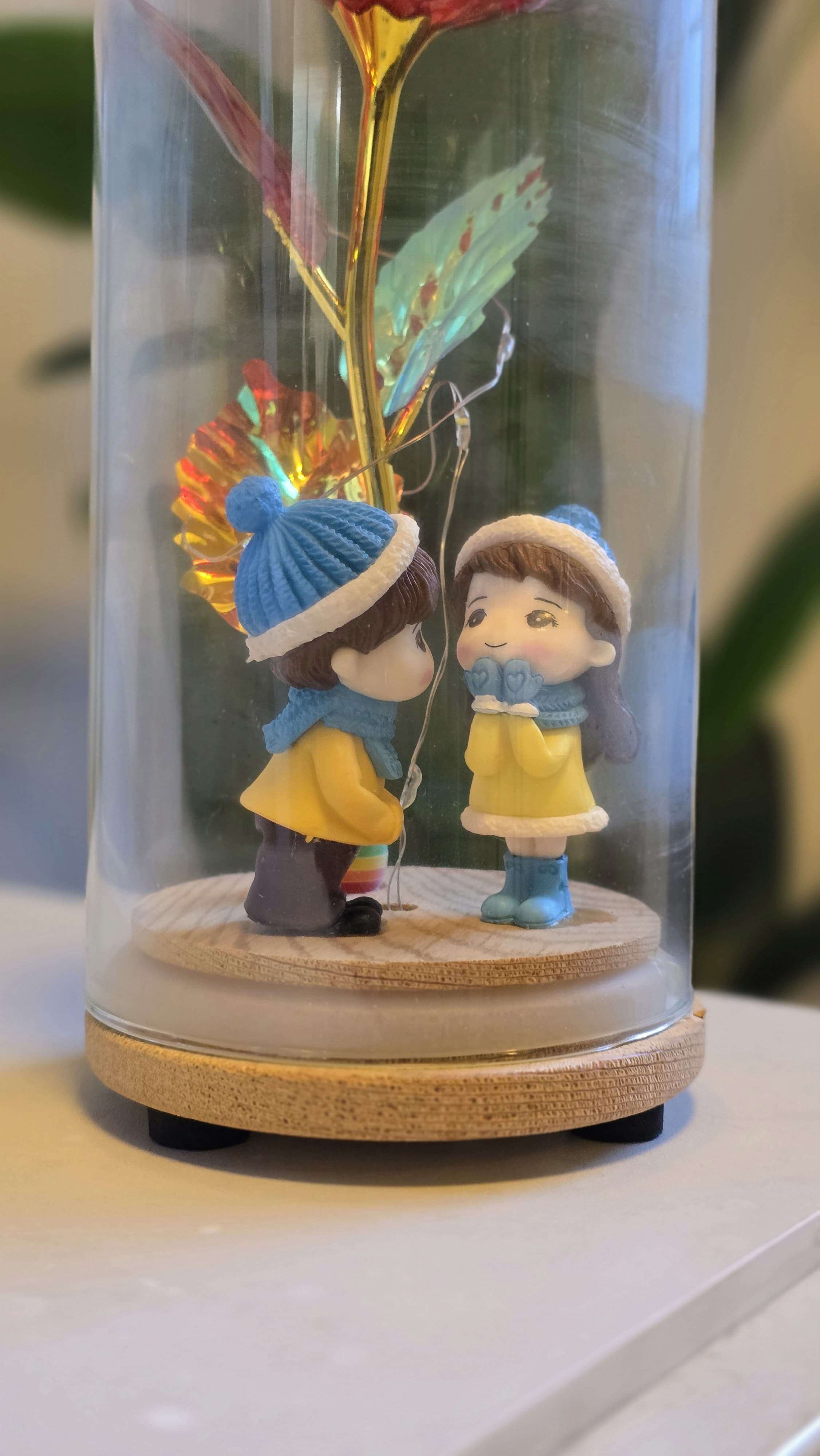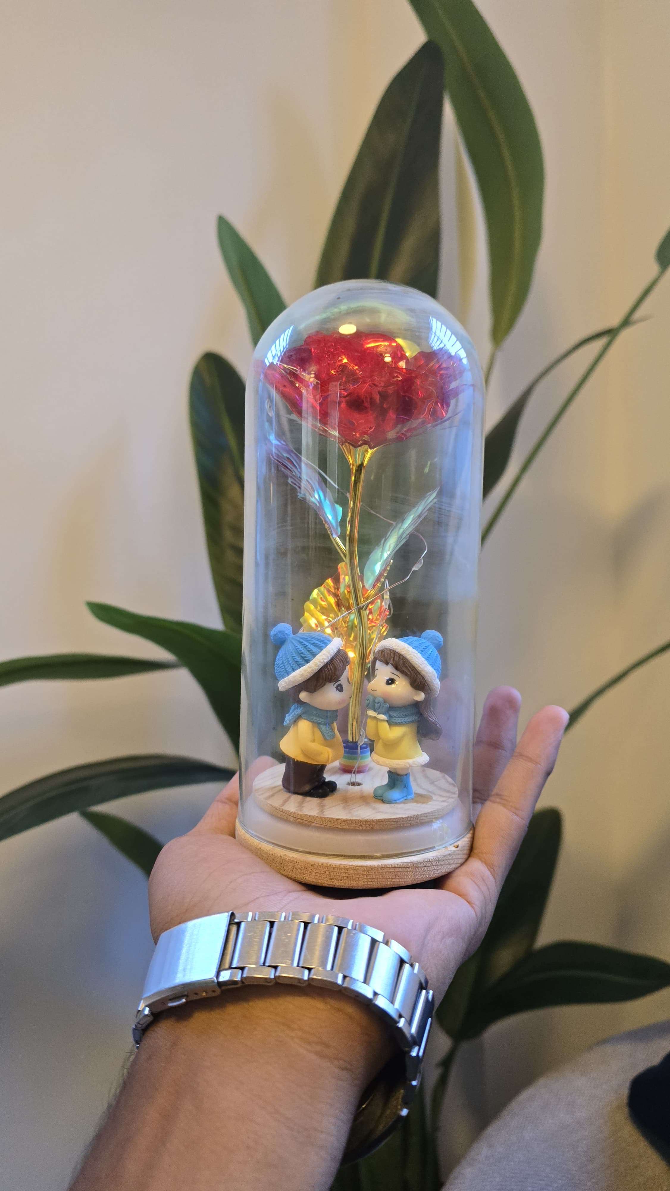 Elegant golden flower with love couple figurine inside a glass dome – a romantic and meaningful gift for anniversaries, Valentine’s Day, birthdays, or home decoration.