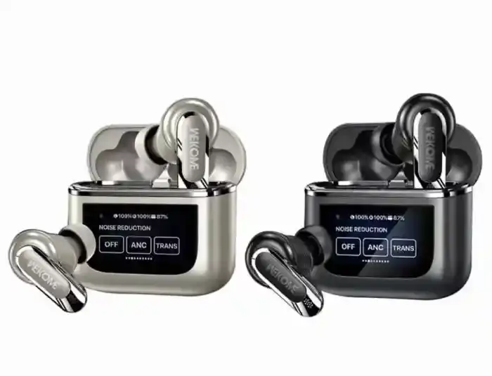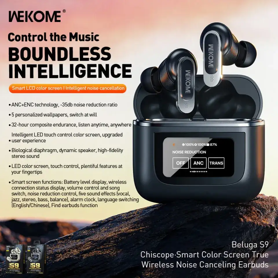 Experience premium sound with WEKOME Beluga S9 ANC TWS Earphones—featuring 13mm drivers, ANC+ENC noise cancellation, smart LED touch screen, and up to 32-hour battery life.